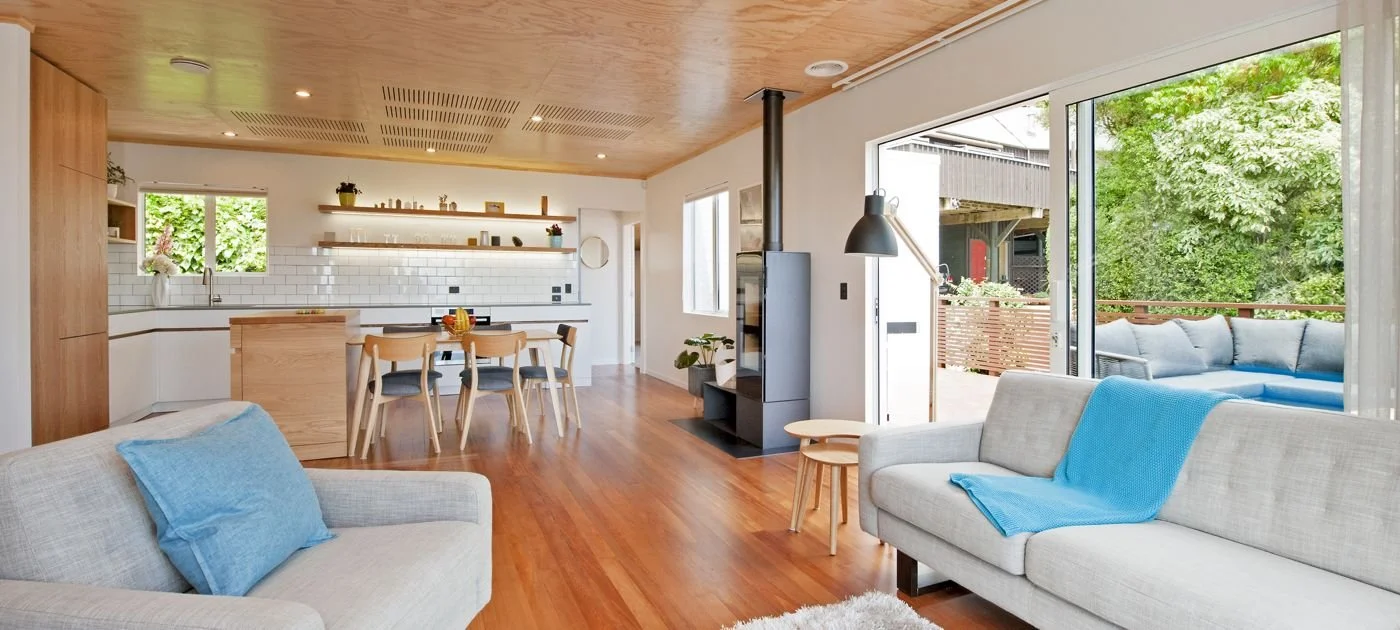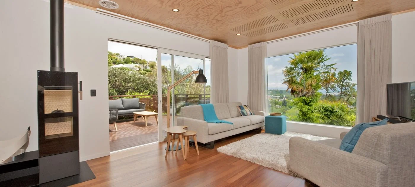 Detail was everything in this build. Special plywood panel ceilings with integrated sound-control panels were installed, paired with beautifully finished rimu flooring that brings warmth and character to the space. A unique, pivoting fireplace became a standout feature, allowing the homeowners to direct heat exactly where they want it.
