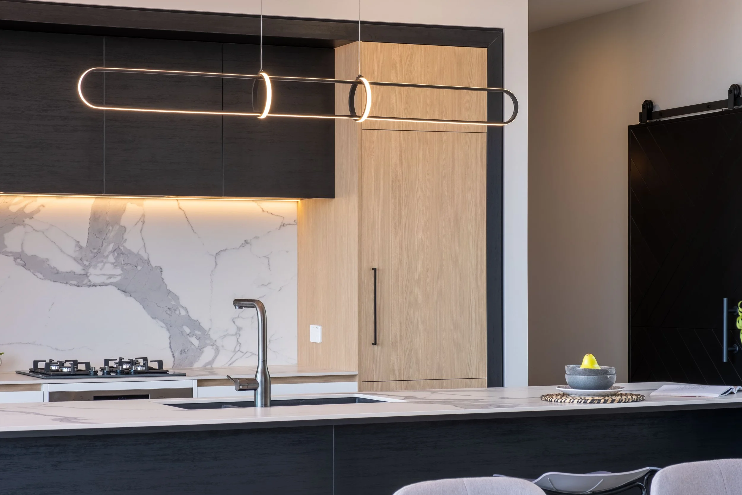 The kitchen is a highly integrated European design. Kapiti Coast interior designer Rachel Steinmetz from Appletree Designs assisted in the design of this and other interior features. A particular favourite of Antioneta’s throughout the house is the hard-tofind gun-metal tapware. “I was determined to have it everywhere because I really love the look,” she says. She also adores the bench tops and splashback in striking Italian marble style porcelain. “It is a wonderful contrast to the black finish of the central island,” she says.